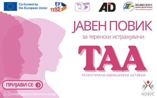 Центарот за истражување и анализа НОВУС објавува Јавен повик за ангажман на два (2) теренски истражувачи за спроведување на теренско истражување во рамки на проектот „Талентирани, Амбициозни, Активни – ТАА“, кој се спроведува во рамки на проектот „Од несвесни за различностите до трансформативни локални заедници кои ја препознаваат различноста и инклузивната еднаквост“, финансиран од Делегацијата […]