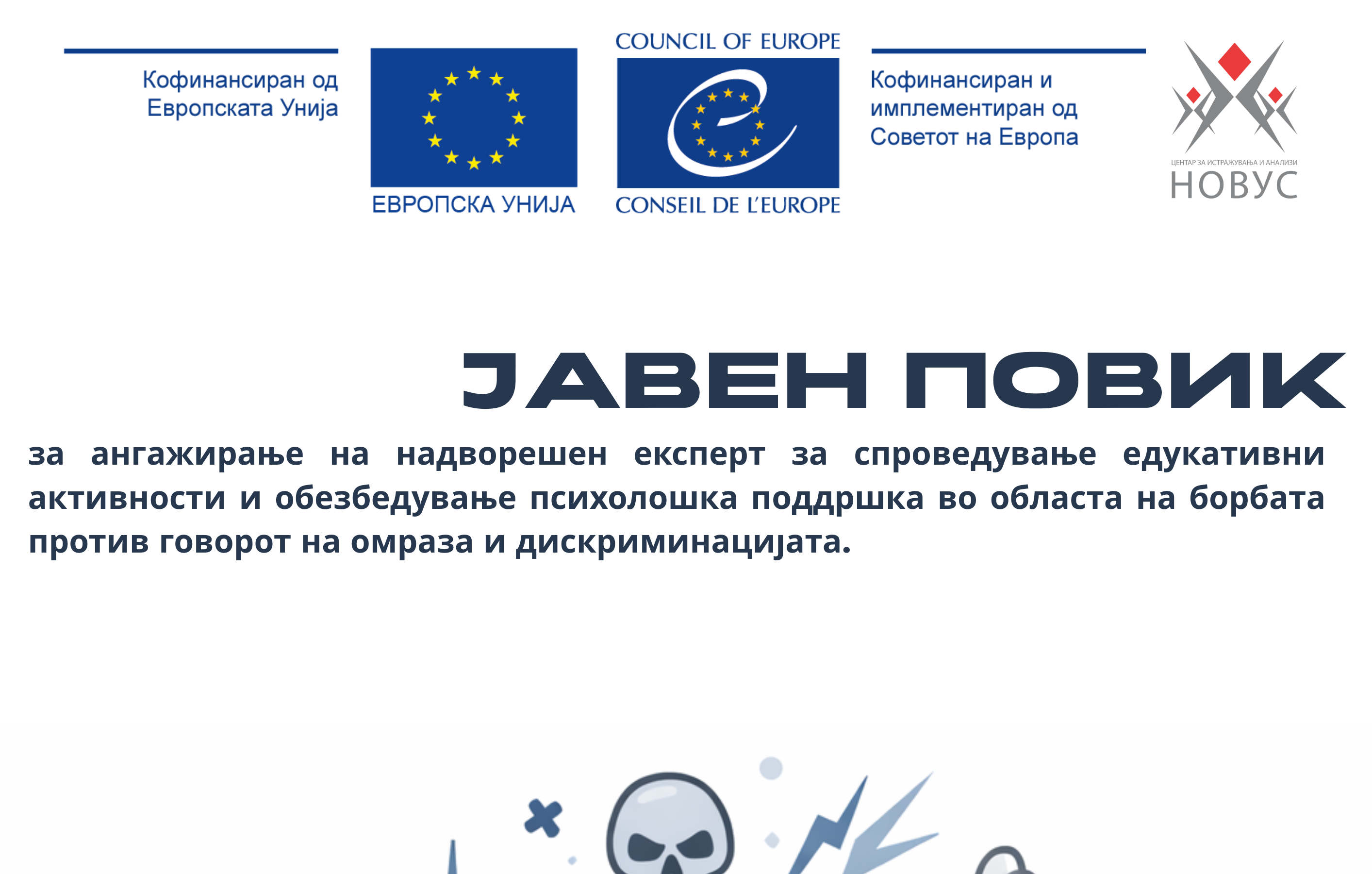 Центарот за истражување и анализи НОВУС – Струмица објавува Јавен повик за ангажирање на надворешни експерти за спроведување едукативни активности и обезбедување психолошка поддршка во областа на борбата против говорот на омраза и дискриминацијата. Овој јавен повик се објавува во рамки на проектот „Борба против омразата и нетолеранцијата“, дел од заедничката програма на ЕУ и […]