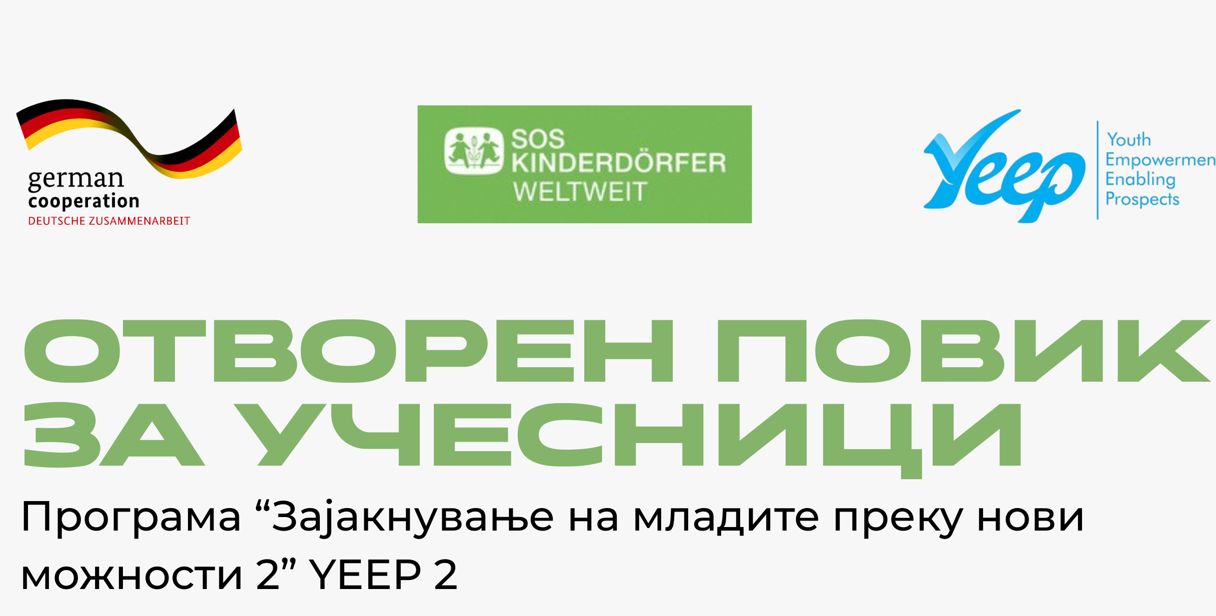 Центарот за истражување и анализа НОВУС и СОС Детско Село Македонија во партнерство со BMZ и SOS Kinderdörfer Weltweit го објавуваат последниот повик за учество во програмата YEEP 2 – Зајакнување на младите преку нови можности. Оваа програма има за цел да им помогне на младите лица на возраст од 16 до 35 години да […]